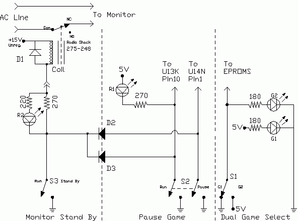 The relay is radio shack #275-248. Be very careful installing the relay. If you do it wrong it could ruin your game. First unplug the game. Make sure the Common and Normally Closed contacts are installed inline with one of the monitor's power leads and the normally open contact is not connected. You could use a different relay, but the circuit prefers a 12V/400 Ohm coil. D1,D2,& D3 can be any small signal diodes like a 1N914, 1N4148 or similar. R1,R2,G1, &G2 are red and green LEDs.